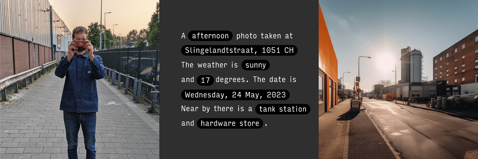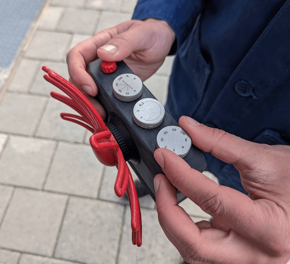 У Paragraphica есть тумблеры, регулирующие область отсканированного пространства, резкость, зернистость и четкость фотографии. Если рассматривать элементы управления слева направо, то первая ручка отвечает за радиус области, которую ИИ использует для поиска области. На обычном фотоаппарате это можно сравнить с фокусным расстоянием. Второй ручкой можно регулировать зернистость, а последней — чёткость.